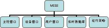 由MCGS生成的用戶應(yīng)用系統(tǒng),其結(jié)構(gòu)由主控窗口、設(shè)備窗口、用戶窗口、實時數(shù)據(jù)庫和運行策略五部分組成。如下圖所示