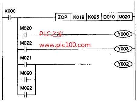 一個(gè)加熱控制系統(tǒng)要求當(dāng)前溫度對(duì)照一個(gè)溫度范圍來校核,此范圍規(guī)定了一個(gè)周圍工作環(huán)境。本例將存儲(chǔ)在D010中的溫度值,由調(diào)溫器THR1讀出,與K19和K25作比較。這溫度范圍表示一個(gè)舒適的辦工環(huán)境。做完比較,必須有一個(gè)結(jié)果,這個(gè)結(jié)果經(jīng)比較得到3個(gè)主要狀態(tài),即>、=、<。這3個(gè)狀態(tài)可用位標(biāo)志表示,本例中使用了M20到M22。