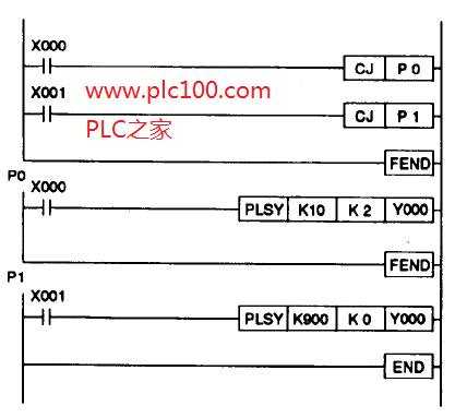 一個(gè)主程序中不允許使用兩個(gè)PLSY指令,但可把每種情況插入到由條件跳轉(zhuǎn)指令調(diào)用的子程序中,當(dāng)兩種情況中的任一種條件滿足時(shí),調(diào)用相應(yīng)的子程序。在本例中,使用門鈴時(shí),程序跳轉(zhuǎn)至P0處,即表示指針P0的程序被激活。當(dāng)要求使用警鈴時(shí),P1被調(diào)用,因此跳轉(zhuǎn)到程序指針P1處。