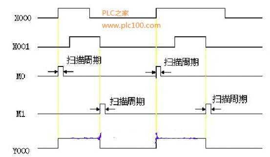 •使用PLF指令時,僅在驅(qū)動輸入OFF后1個掃描周期內(nèi),軟元件Y、M動作。