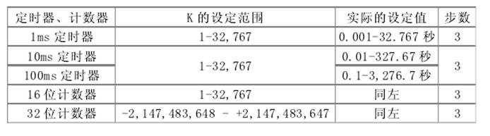 常數(shù)K的設(shè)定范圍、實際的定時器常數(shù)、相對于OUT指令的程序步數(shù)(包括設(shè)定值)如下表所示。