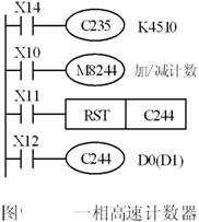 圖1中的C244是1相帶起動(dòng)/復(fù)位端的高速計(jì)數(shù)器,由表1可知,Xl和X6分別為復(fù)位輸入端和起動(dòng)輸入端,它們的復(fù)位和起動(dòng)與掃描工作方式無(wú)關(guān),其作用是立即的和直接的。如果X12為ON,一旦X6變?yōu)?/span>ON,立即開(kāi)始計(jì)數(shù),計(jì)數(shù)輸入端為X0。X6變?yōu)?/span>OFF,立即停止計(jì)數(shù),C244的設(shè)定值由D0和D1指定。除了用Xl來(lái)立即復(fù)位外,也可以在梯形圖中用復(fù)位指令復(fù)位。