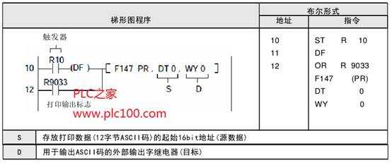 將存放在由S指定的6個(gè)字的存儲(chǔ)區(qū)中的12個(gè)字符的ASCII碼輸出由D指定的外部字繼電器WY。