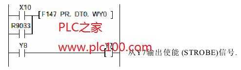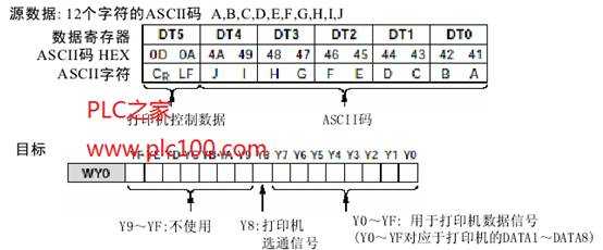 當(dāng)執(zhí)行條件(觸發(fā)器)R10為ON時(shí),通過外部數(shù)據(jù)字繼電器WY0,輸出存放在數(shù)據(jù)寄存器DT0~DT5的ASCII碼。