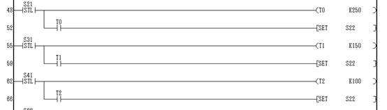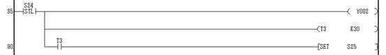 狀態(tài)轉(zhuǎn)移到S24,起動Y02(電機正轉(zhuǎn)),T3計時3秒.計時完畢狀態(tài)轉(zhuǎn)移到S25.正轉(zhuǎn)完畢.