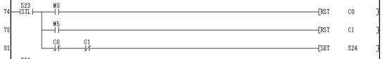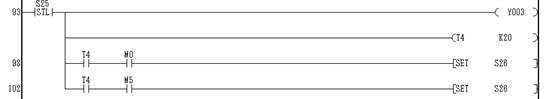 狀態(tài)轉(zhuǎn)移到S25,起動Y03(電機反轉(zhuǎn)),T4計時2秒.