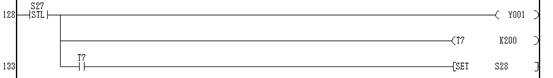 狀態(tài)轉(zhuǎn)移到S27,起動Y01(排水).T7計時20秒,然后T7置1,狀態(tài)轉(zhuǎn)移到S28.