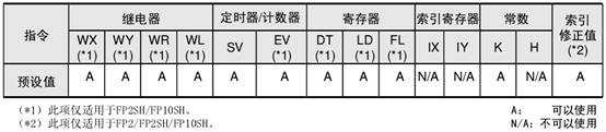 對(duì)于FP0、FP2、FP2SH、FP10SH,CPU版本為4.4或更高的FP-C、FP3和CPU版本為2.7或更高的FP-M、FP1,設(shè)定值區(qū)號(hào)(SV)可直接指定為計(jì)時(shí)器設(shè)定值。