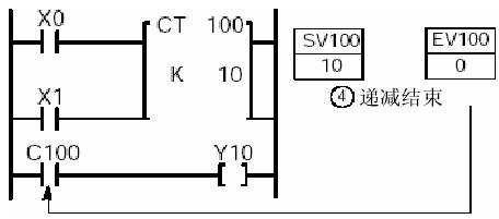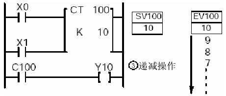 在計(jì)數(shù)指令中,當(dāng)檢測(cè)到計(jì)數(shù)輸入信號(hào)由OFF到ON的變化時(shí),進(jìn)行遞減操作。