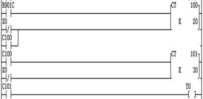 圖4-49是由兩個計數(shù)器組成的延時電路。輸入Ⅹ0端接通后,CT100開始對R901C(1s時鐘脈沖)進行減計數(shù)。經(jīng)過20s,CT100有輸出,其常開觸點C100閉合。CT101對C100常開觸點的動作計數(shù)一次。與此同時C100常開觸點也將CT100復位,C100常開觸點又斷開,CT100繼續(xù)對R901C計數(shù)。又經(jīng)過20s,CT101又對C100常開觸點計數(shù)一次……。如此循環(huán),經(jīng)過20s×30=600s后,CT101有輸出,其常開觸點C101閉合,接通輸出繼電器Y0。