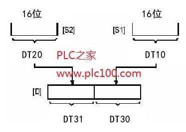 當(dāng)觸發(fā)器為ON時,由S1和S2指定的兩個16位數(shù)據(jù)或兩個16位等值常數(shù)被復(fù)制到由時旨定的32位區(qū)。