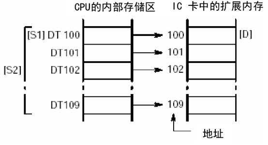 存儲(chǔ)于CPU中以S1開始的S2個(gè)字的數(shù)據(jù)被傳輸?shù)接?/span>D指定的IC卡的擴(kuò)展存儲(chǔ)區(qū)。