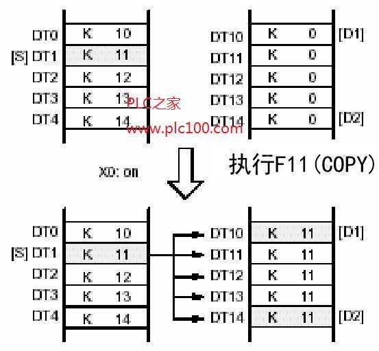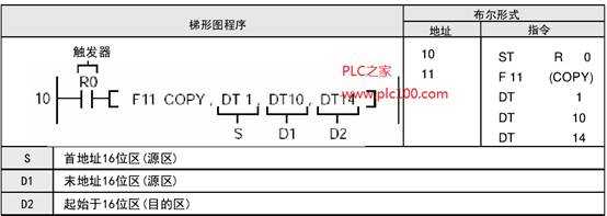 當(dāng)觸發(fā)器R0為ON時(shí),數(shù)據(jù)寄存器DT0的內(nèi)容復(fù)制到數(shù)據(jù)寄存器DT10至DT14的數(shù)據(jù)塊中。