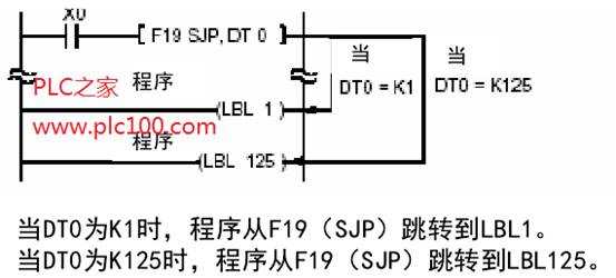 根據(jù)由F19( SJP)指令指定的數(shù)據(jù)區(qū)中的數(shù)值,跳轉(zhuǎn)到具有相同數(shù)值的LBL指令處。