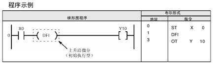當(dāng)PLC模式改為運行(RUN)、或PLC在運行模式下接通電源時,如果此時觸發(fā)器(執(zhí)行條件)已經(jīng)閉合,則使用DF指令不能在第一個掃描周期產(chǎn)生輸出。因此,在此情況下應(yīng)使用DFI指令。