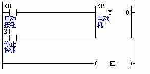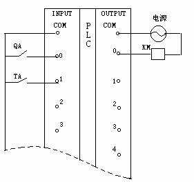 當(dāng)0號輸入接點的輸入端(QA)接通時,輸入繼電器X0線圈受激,其常開觸點X0閉合,輸出繼電器線圈Y0受激并由其常開觸點自保持。交流接觸器KM得電,電動機(jī)正常啟動。當(dāng)1號輸入接點的輸入端(TA)接通時,輸入繼電器Xl的線圈受激,其常閉觸點打開Y0線圈失電并打開自鎖,電動機(jī)停止運(yùn)行。