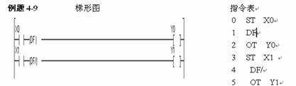 DF/:后沿(下降沿)微分指令,輸入脈沖后沿使指定繼電器接通一個(gè)掃描周期,然后復(fù)位。
