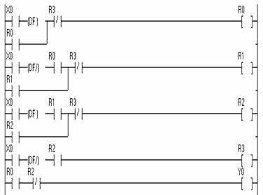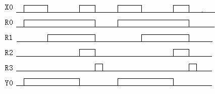 分析可見,該梯形圖控制的被控信號(hào)Y0是輸入信號(hào)X0的二分頻,故可稱之為二分頻電路。另外,此功能在工程上可實(shí)現(xiàn)一個(gè)控制按鈕控制一個(gè)輸出設(shè)備的啟動(dòng)/停止。即在Y0斷開的情況下X0第一次接通Y0輸出,X0第二次接通Y 0斷開。以此可節(jié)約輸入接點(diǎn)。