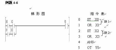 “組與”指令(ANS)是用來串聯(lián)指令塊的。每一指令塊以ST或ST/指令開始,可以多個指令塊串聯(lián)。編寫指令表時可以用兩種書寫方法,一種方法是先輸入兩個觸點組塊,將其“塊與”(ANS)后與第三個組塊再“塊與”以此類推,直至把所有的觸點組輸入完畢。另一種方法是先連續(xù)輸入觸點組,再連續(xù)進行“塊與”操作,如圖4-9所示 。