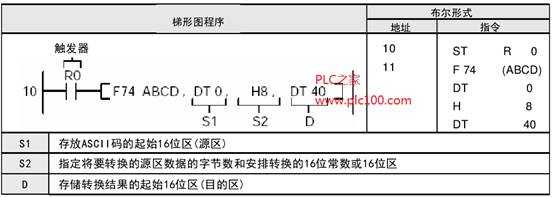 將從由S1指定的16位區(qū)開始的、表示十進(jìn)制的ASCII碼,根據(jù)S2的指定,轉(zhuǎn)換為BCD碼。轉(zhuǎn)換數(shù)據(jù)存儲(chǔ)在從D指定的16位區(qū)開始的數(shù)據(jù)區(qū)內(nèi)。