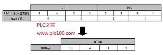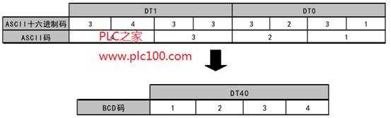 當(dāng)觸發(fā)器R0為ON時(shí),將存儲(chǔ)于數(shù)據(jù)寄存器DT1和DT0中的表示十進(jìn)制數(shù)的ASCII碼轉(zhuǎn)換為的BCD碼。轉(zhuǎn)換的結(jié)果存儲(chǔ)于數(shù)據(jù)寄存器DT40。