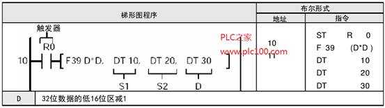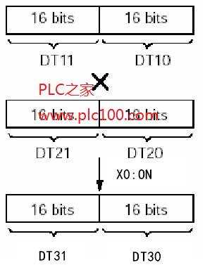當(dāng)觸發(fā)器R0為ON時,數(shù)據(jù)寄存于DT11和DT10的內(nèi)容與數(shù)據(jù)寄存器DT21和DT20的內(nèi)容相乘。乘積保存于數(shù)據(jù)寄存器DT31和DT30中。