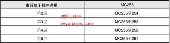 與CALL指令相同,FCAL指令最多可以使用五層嵌套。但是,根據(jù)嵌套層次的不同,某些MC的編號(hào)不能使用。如下表所示。