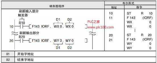 當執(zhí)行條件(觸發(fā)器)R10為ON時,立即刷新輸入繼電器WX0 (X0-XF):當執(zhí)行條件(觸發(fā)器)R20為ON時,立即刷新輸出繼電器WYO (Y0-YF)。