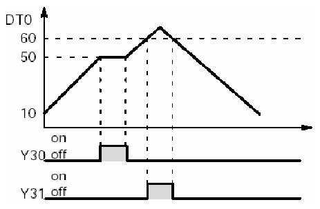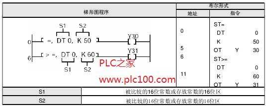 分別將數(shù)據(jù)寄存器DT0的內(nèi)容與K50和K60進(jìn)行比較。若DT0=K50,則外部輸出繼電器Y30為ON;若DT0≥K60,則外部輸出繼電器Y31為ON。