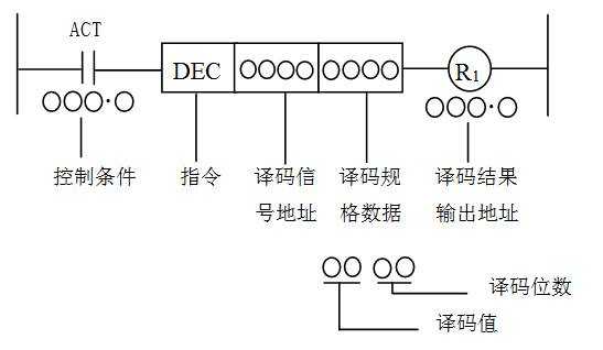 DEC指令的工作原理是,當控制條件ACT=0時,不譯碼,譯碼結果繼電器Rl斷開。當控制條件ACT=1時執(zhí)行譯碼,當指定譯碼信號地址中的代碼與譯碼規(guī)格數(shù)據(jù)相同時,輸出R1=1,否則Rl=0。譯碼輸出Rl的地址由設計人員確定。