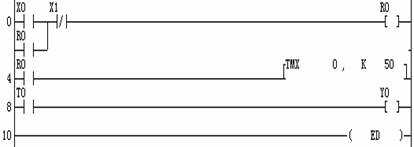當(dāng)輸入Ⅹ0端子的信號(hào)接通時(shí),輸入繼電器的線圈Ⅹ0接通,其常開觸點(diǎn)Ⅹ0閉合,內(nèi)部繼電器R0接通,其常開觸點(diǎn)R0閉合,接通定時(shí)器T0,T0的設(shè)定值K50開始遞減。減至“0”時(shí)T0的常開觸點(diǎn)閉合,輸出繼電器Y0相對(duì)于X0延遲5s后接通。當(dāng)輸入端Ⅹ1接通后,內(nèi)部繼電器R0失電,R0的常開觸點(diǎn)斷開,定時(shí)器T0復(fù)位。T0的常開觸點(diǎn)斷開,使輸出Y0為0FF。