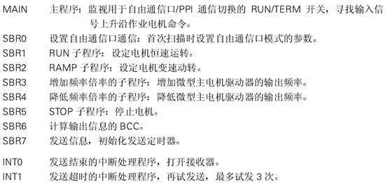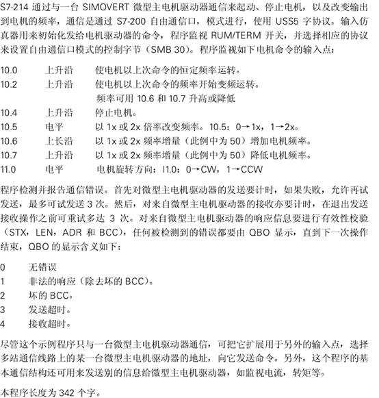 S7-214通過與一臺(tái)SIMOVERT微型主電機(jī)驅(qū)動(dòng)器通信來起動(dòng),停止電機(jī),以及改變輸出到電機(jī)的頻率。通信是通過S7-200自由通信口模式進(jìn)行,使用USS5字協(xié)議。輸入仿真器用來初始化發(fā)給電機(jī)馭動(dòng)器的命令。