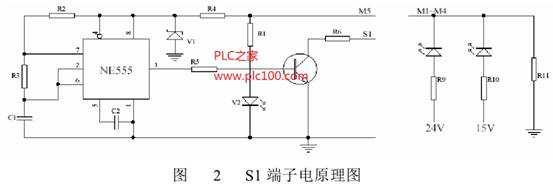 注:郵件分揀機實驗板的輸入端子為一特殊設計的端子,其原畫圖如圖2所示,它的功能是:當輸出端MS為ON時,S1自動產生脈沖信號模擬測量電動機轉速光碼盤信號。