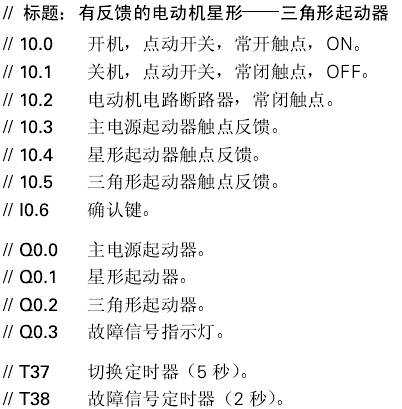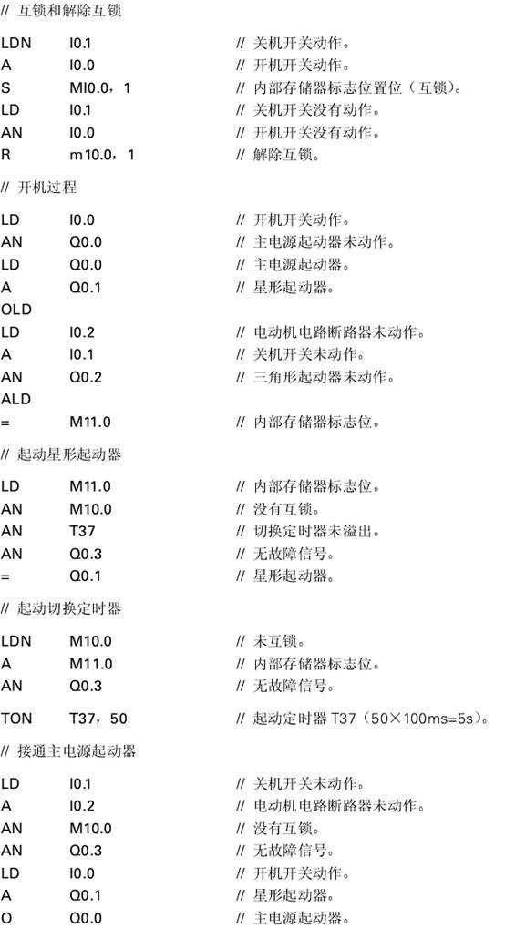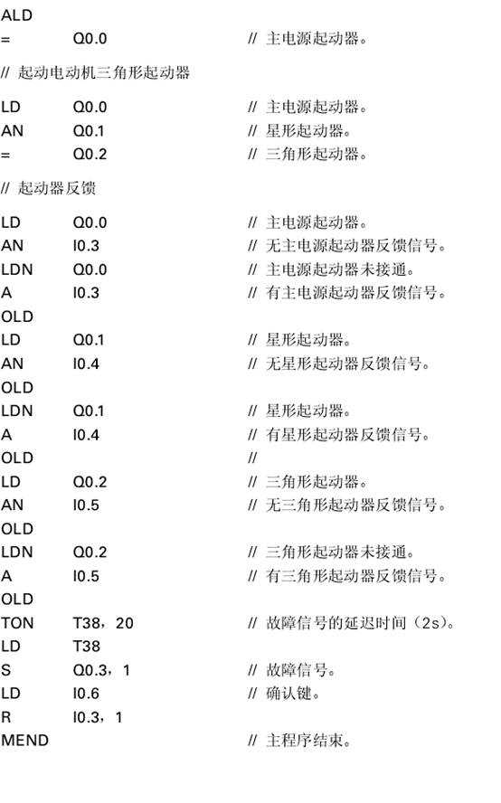 當(dāng)輸入點(diǎn)l0.0相連的開機(jī)開關(guān)(0N)動作后,電動機(jī)繞組接成星形工作方式起動。如果沒有起動器故障信號,電動機(jī)繞組將在5秒鐘后切換到三角形連接方式。故障信號山與輸出點(diǎn)Q0.3相連的信號燈指示。當(dāng)故障排除后,操作員按與輸入點(diǎn)I0.6相連的確認(rèn)鍵,即可消除故障信號。起動器反饋信號通過輸入點(diǎn)I0.3、I0.4和I0.5引入。