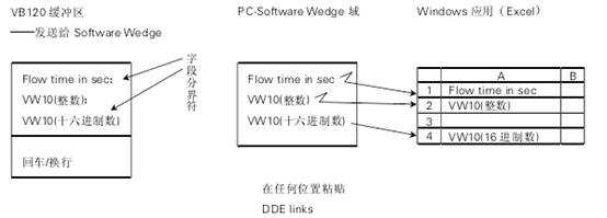 裝載完SoftwareWedge軟件包后,選擇DDE服務(wù)器方式,指定DDE應(yīng)用名、題目及適用的項(xiàng)目,接著把通信u設(shè)定為9600波特,沒(méi)有奇偶校驗(yàn),每個(gè)字符8位,1個(gè)停n位。記住所設(shè)定的通信日是好的。最后,要輸入的記錄結(jié)構(gòu)必須定義。在下面程序中,從收到任一字符作為記錄的開(kāi)始,收到一個(gè)回車和換行作為記錄的結(jié)束,選擇多個(gè)數(shù)據(jù)字段,用3作為字段的最大數(shù)目,用“:" (ASCII碼為58)號(hào)作為字段分界符。最后,在Windows應(yīng)用中,用拷貝/粘貼聯(lián)接命令把小同數(shù)據(jù)字段粘貼在屏幕上所要求的部分。