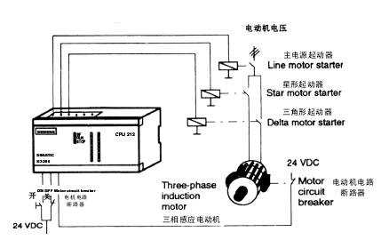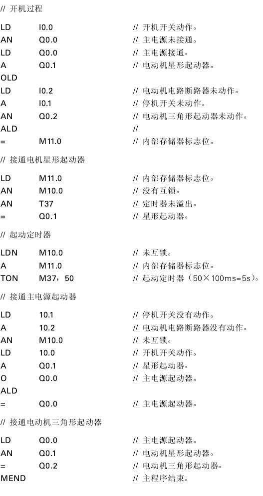 這個示例程序控制三相感應電動機的星形—三角形起動過程。當與輸入點10.0相連的點動開關ON(開機)接通時,電動機繞組星形連接運轉(zhuǎn)。經(jīng)過預置時問5秒鐘后,電動機繞組切換為三角形連接。