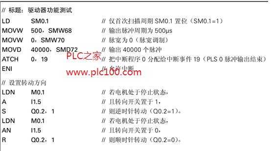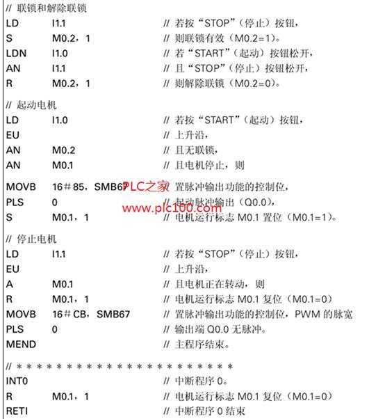 如果同時具備上述2個條件,則將標(biāo)志M0.1復(fù)位(M0.1=0),并中斷輸出端Q0.0的脈沖輸出。這與執(zhí)行PLSO指令有關(guān),它將脈寬調(diào)制(PWM)輸出的脈沖寬度減為0(所需的基本設(shè)置己在第一個掃描周期中定義了),因而輸出信號被抑制。