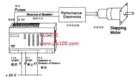 本例敘述用Q0.0的輸出脈沖觸發(fā)步進電機馭動器。當(dāng)輸入端I1.0發(fā)出“START”(起動)信號后,控制器將輸出固定數(shù)目的方波脈沖,使步進電機按對應(yīng)的步數(shù)轉(zhuǎn)動。當(dāng)輸入端I1.1發(fā)出“STOP"(停止)信號后,步進電機停比轉(zhuǎn)動。接在輸入端I1.5的方向開關(guān)位置決定電機正轉(zhuǎn)或反轉(zhuǎn)。