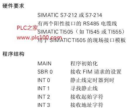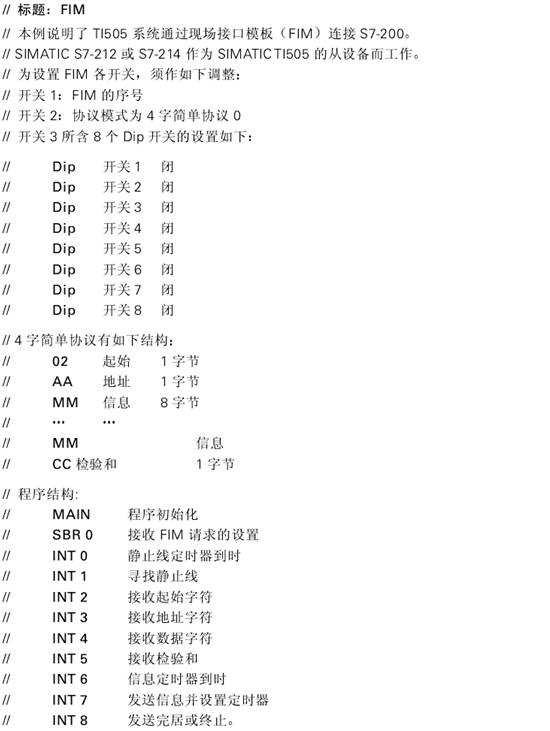 本例描述了如何將SIMATIC S7-212(或S7-214)與SIMATIC T1505可編程邏輯控制系統(tǒng)連接起來(lái)。主設(shè)備(T1505}通過(guò)現(xiàn)場(chǎng)接u模板((FIM)向從設(shè)備(S7-212發(fā)送信息。數(shù)據(jù)傳輸?shù)膮f(xié)議為4字(4-Word)簡(jiǎn)單協(xié)議。這樣T1505可控制新型SIMATIC PLC及其它支持此協(xié)議的設(shè)備(例如某些SE &A馭動(dòng)器)。