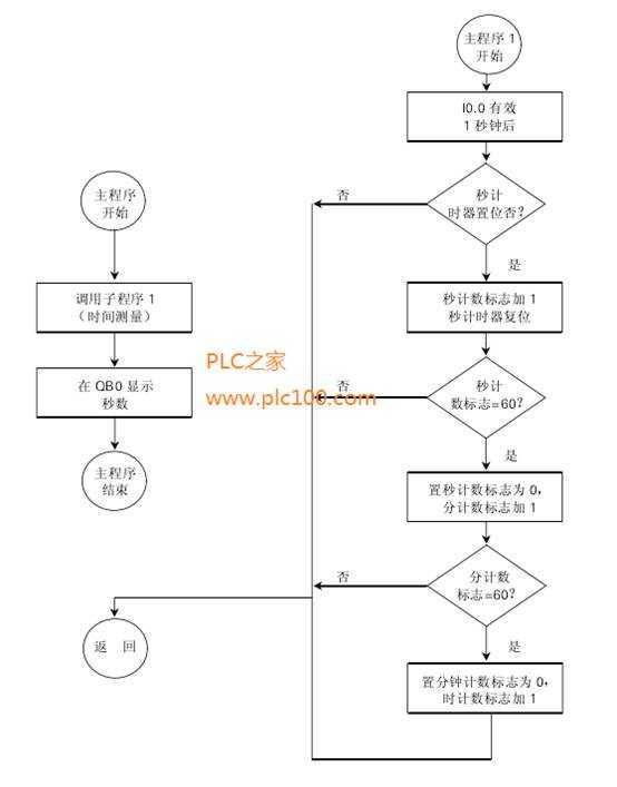當(dāng)秒計(jì)數(shù)標(biāo)志達(dá)到60時(shí),分鐘計(jì)數(shù)標(biāo)志VW2增加1,秒計(jì)數(shù)標(biāo)志VW4被置為0.
