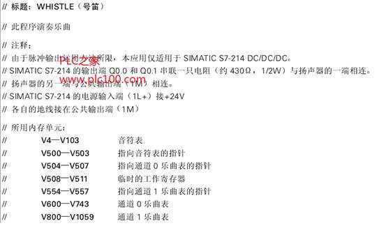 這個應(yīng)用例子展示怎樣利用S7-214 DC/DC/DC PLC的脈沖輸出功能演奏音樂。為了使音調(diào)能持續(xù)0.125秒,25個音符周期時問用與之對應(yīng)的脈沖數(shù)存放在音符表中。因為是同時演奏2個音符,所以另有兩個樂曲表格為通道0和通道1存儲樂曲信息。
