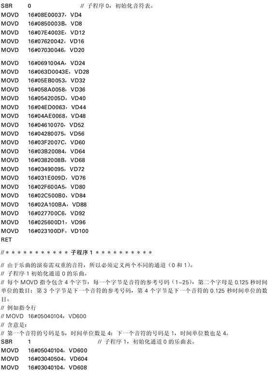 中斷子程序附著于P丁O完成事件。第一個音符演奏完,中斷程序調(diào)用下一個音符。這個過程繼續(xù)下去,自到樂曲結(jié)束。