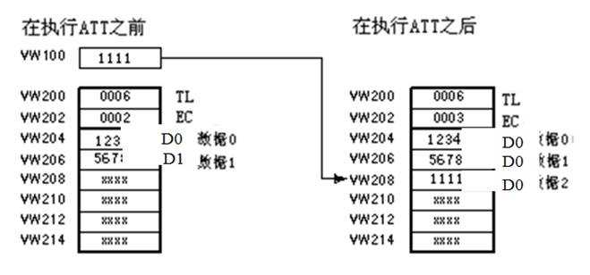 填表指令應(yīng)用舉例。將VW100中的數(shù)據(jù)1111,填入首地址是VW200的數(shù)據(jù)表中(圖1)。程序及運行結(jié)果如圖2所示。