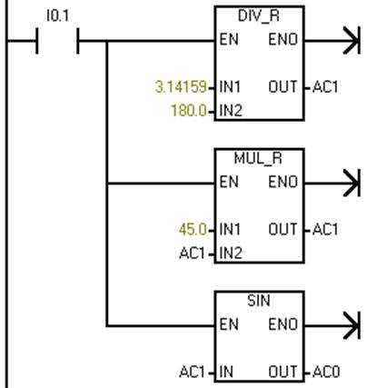 分析:先將45º轉(zhuǎn)換為弧度:(3.14159/180)*45,再求正弦值。程序如圖5-20所示。
