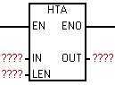 HEX至ASCII (HTA)指令將從輸入字節(jié)(IN)開始的長度為LEN的十六進制數(shù)轉(zhuǎn)換成ASCII字符,放入從OUT開始的存儲單元 |