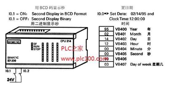 為了讀或?qū)懛奖?,這些數(shù)據(jù)用BCD碼存儲(chǔ)。當(dāng)操作開關(guān)10.0為1時(shí),就將預(yù)定日期和時(shí)間寫入實(shí)際時(shí)鐘。為了顯示當(dāng)前的秒值,將其值拷貝到輸出字節(jié)QB0。當(dāng)10.1=1時(shí),則用BCD碼顯示;當(dāng)10.1=0時(shí),則用二進(jìn)制碼顯示。