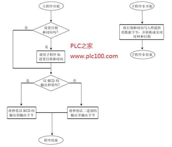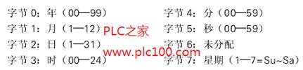 通過按輸入開關(guān)10.0可調(diào)用子程序0。這個(gè)子程序按照要求的日期和時(shí)問,預(yù)先將其值置入VB100到VB107這8個(gè)字節(jié),然后用TODW指令,將此設(shè)置傳送給實(shí)時(shí)時(shí)鐘。