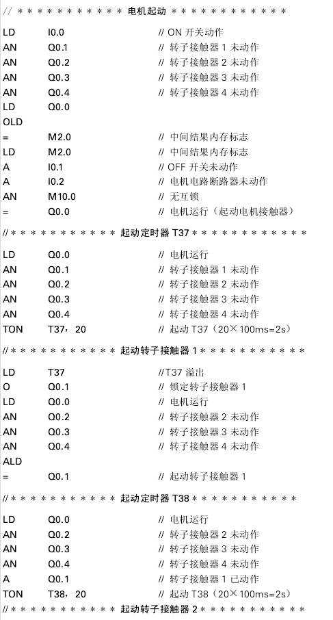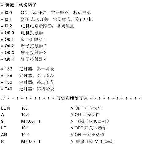 這個示例程序說明了4級線繞轉子三相異步電動機的自動起動過程。電動機起動時轉子為滿電阻。經(jīng)過一定時問后,第一個轉子觸點閉合并短接部分轉子電阻。又經(jīng)過一定時問后,后續(xù)觸點逐步受到控制,而轉子電阻每次都減小自至其完全短接,最終電動機以額定轉速運行。