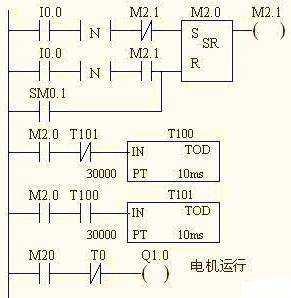 動(dòng)作原理:PLC通電運(yùn)行的第一個(gè)掃描周期,SM0.1=1,使M2.0=0電機(jī)不工作,按一下啟動(dòng)按鈕I0.0,SR觸發(fā)器翻轉(zhuǎn),M2.0=1,使電機(jī)上電運(yùn)轉(zhuǎn)。同時(shí)使T100上電,延時(shí)5分鐘,T100吸合,其常閉點(diǎn)斷開(kāi),使電機(jī)停轉(zhuǎn),T100的常開(kāi)觸點(diǎn)閉合,使T101上電開(kāi)始延時(shí),延時(shí)5分鐘,T101吸合,其常閉觸點(diǎn)斷開(kāi),使T100斷電,T100斷電又使T101斷電,T101斷電其常閉點(diǎn)閉合,使電機(jī)又通電運(yùn)行………………,如此這樣電機(jī)運(yùn)行5分鐘停止5分鐘循環(huán)運(yùn)行。如果此時(shí)按一下I0.0,會(huì)使SR觸發(fā)器翻轉(zhuǎn),使M2.0=0,電機(jī)停止工作。