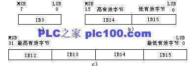 (4)“雙字”存取方式:相鄰的四個字節(jié)表示一個雙字,四個字節(jié)的地址必須連續(xù)。最低位字節(jié)在一個雙字中應該是最高8位。ID12表示由IB12~IB15組成的雙字,I為區(qū)域標識符,D表示存取雙字(Double Word),12為起始字節(jié)的地址。ID12中的IB12應該是最高8位,IB15應該是最低8位。如圖: